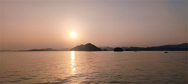 踏上游船甲板,清風習習,甚是舒暢。遠看,綽綽約約的青山一嶂疊著一嶂,好似水墨潑就;近觀,零星島嶼礁石灑落在清靈的湖水之上,仿若空懸。乘船而行,景致開闊而不單調、豐富而不繁雜,不禁感嘆一句:真乃巧奪天工。