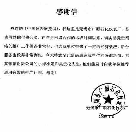 無錫市廣順石化儀表廠在中國儀表展覽網的服務下,開展網絡推廣營銷,為企業產品銷售和渠道拓展起到了切實的推動作用。廣順石化儀表特意傳來感謝信,表達了對中國儀表展覽網和相關工作人員的贊賞和感謝。